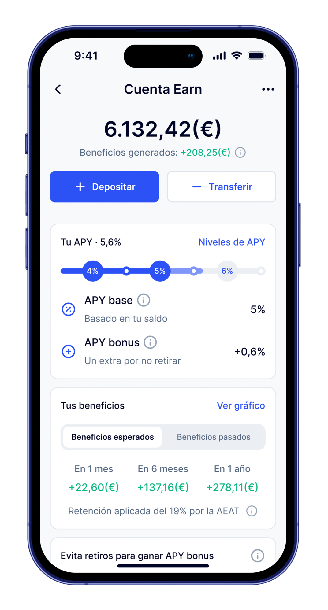 En cuanto a la rentabilidad, recibes un APY base según tu saldo, y además un bonus de fidelidad que se acumula con el tiempo. Gracias a este sistema, cualquier usuario puede alcanzar hasta un 6,5% APY simplemente manteniendo sus ahorros en la cuenta.